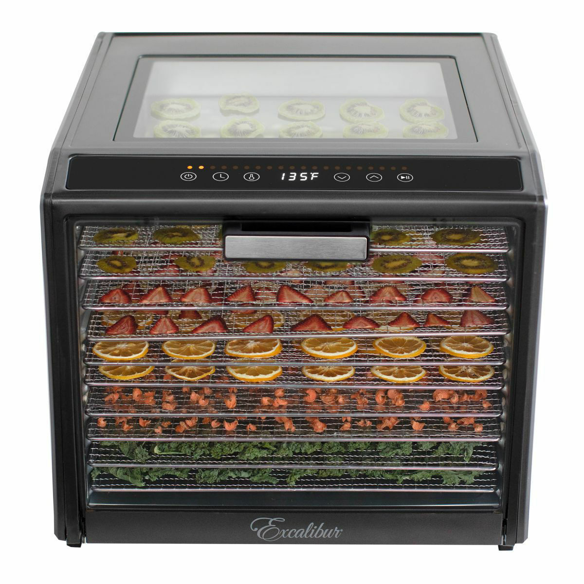 1000 W Power • 10 Stainless-Steel Trays • EZ-View Top Window • Hideaway Door • LED Touchscreen Control • Up to 80-Hour Timer • 29 °C – 74 °C Thermostat • Stainless-Steel Body • High-Capacity Horizontal Airflow • 2-Year Warranty